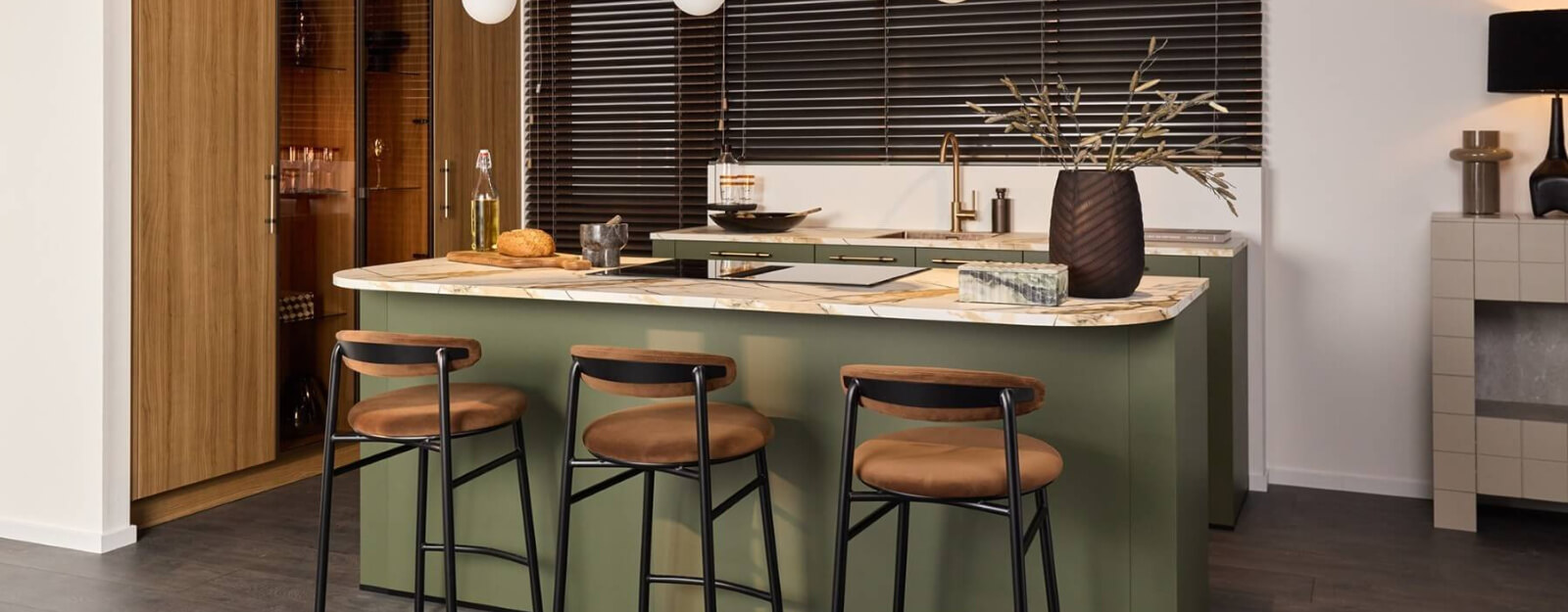 Combinatie van Olympia in de kleur mosgroen met een goudkleurige Vigo greep. De kastenwand is uitgevoerd met Atlas deuren in de kleur licht walnoot in combinatie met glaskasten met bronskleurig frame en bruin rookglas.